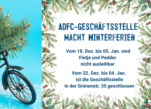 Die ADFC Bremen Geschäftsstelle in der Grünenstraße 35 ist vom 22. Dezember bis 04. Januar in Winterpause