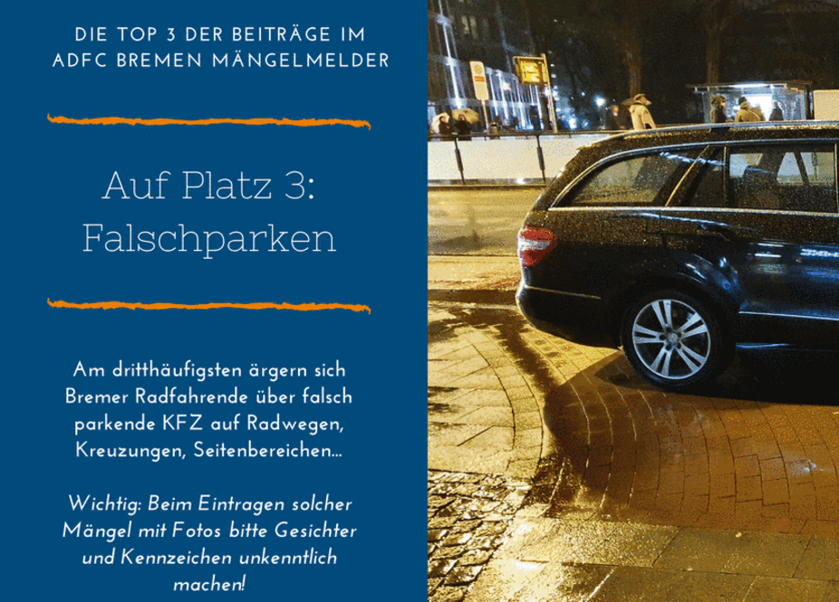 Platz 3 mit 99 Einträgen: Das Falschparken! Am dritthäufigsten ärgern sich Bremer Radfahrende über falsch parkende KFZ auf Radwegen, Kreuzungen, Seitenbereichen …