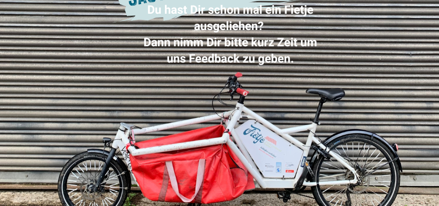 Toll, dass ihr Fietje so fleißig ausleiht und nutzt. Wir würden uns freuen, wenn ihr an unserer Umfrage zur Fietje Nutzung teilnehmt. Für die kontinuierliche Verbesserung unseres Projektes FIETJE - freies Lastenrad Bremen wollen wir gerne Eure Meinung wissen. Die Teilnahme an der Umfrage nimmt etwa zehn Minuten in Anspruch. Mit Eurem Feedback und euren Informationen/Antworten können wir das Projekt stetig verbessern.