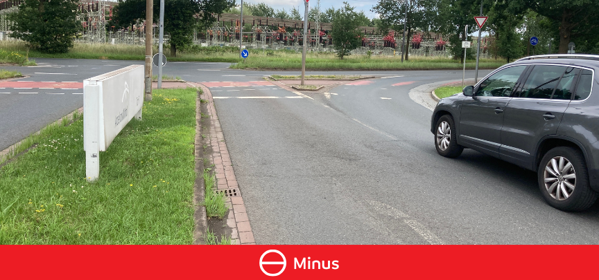 Es ist gut, wenn besonders gefährliche Schnittpunkte mit dem Radverkehr hervorgehoben werden. Zum Beispiel durch eine Rotfärbung der Radwegfurt. Hier müssen und dürfen Menschen mit dem Fahrrad auch aus der „falschen Richtung“ die zu Schichtwechselzeiten stark befahrene Ausfahrt von ArcelorMittal queren. Dort wo die meisten Autos fahren ist dieser wichtige optische Hinweis kaum noch erkennbar. Es ist gefährdend, wenn dann nicht umgehend mit frischer Farbe nachmarkiert wird. Warum die Ampel an dieser Ausfahrt, wie auf alten Bildern zu erkennen ist, abgebaut wurde, ist nicht bekannt – damals hat sie den Radverkehr Auf den Delben deutlich besser geschützt.