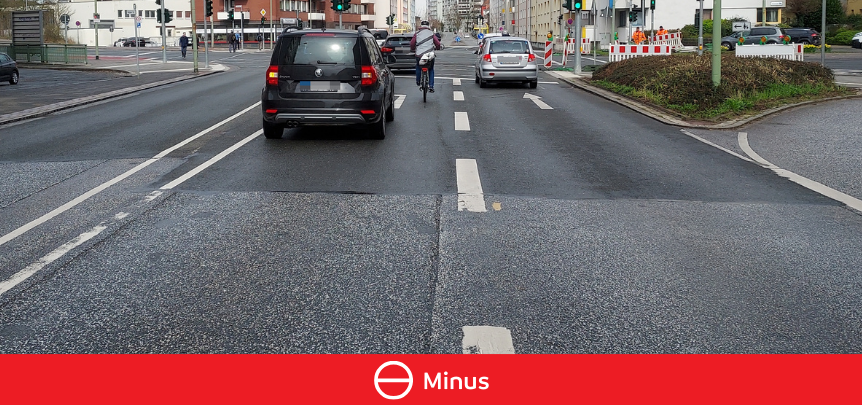 Die Kreuzung wurde gerade frisch saniert mit Mitteln aus dem Fördertopf „Stadt und Land“, ohne dass man ein geschützte Linksabbiegemöglichkeit für den Radverkehr eingerichtet hat. Zu allem Unglück ist die Linksabbiegerspur seit 2025 auch noch Bestandteil des Weserradwegs, den jährlich etwa 30.000 vorwiegend ortsfremde Radfahrende von Bremerhaven in Richtung Norden benutzen. So schafft man radfahrende Gehwegfahrer, aber keine Verkehrswende.