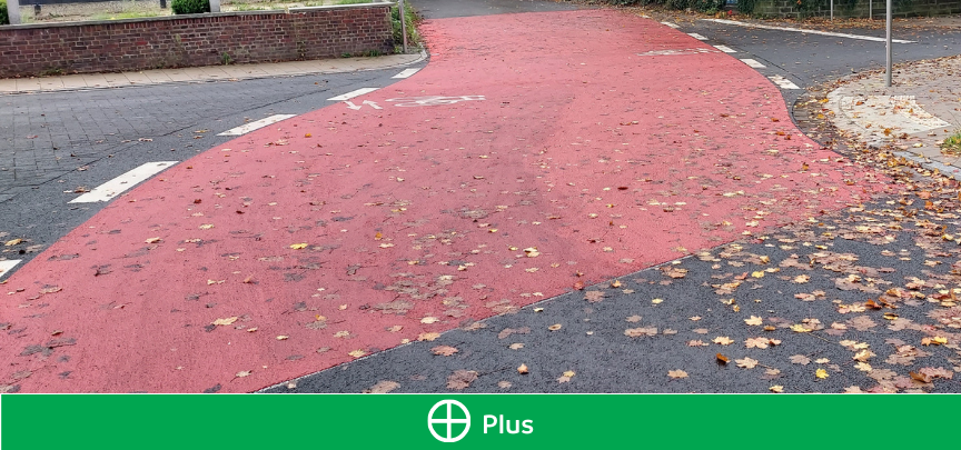 Jetzt hat der Radverkehr hier Vorfahrt gegenüber dem querenden Verkehr. Dies wird verdeutlicht durch eine flächige Rotfärbung in Richtung Am Wischacker. Dort steht auch schon ein erstes Fahrradstraßenschild, allerdings steht der Ausbau weiter südlich noch aus. Die Ausschreibung ist für 2026 vorgesehen.