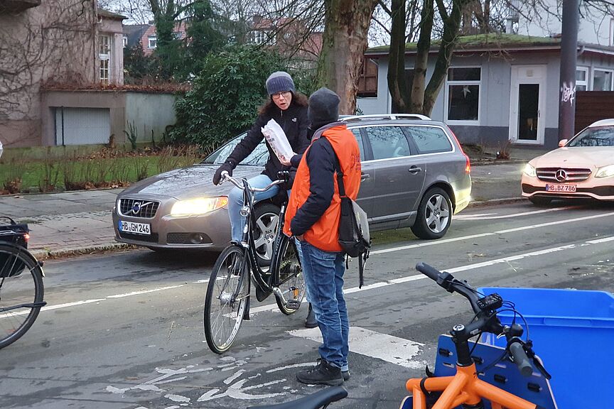 Überrascht wurden wir dann doch von der Vielzahl der Radfahrenden, die morgens die Kreuzung Wachmannstraße / Schwachhauserring / H.-H.-Meier-Allee in und aus allen Richtungen passieren. So waren die prall gefüllten Nikolaustüten schneller alles erwartet verteilt. Allen Radpendler*innen, die heute Morgen leider leer ausgegangen sind sagen wir auch von Herzen Dankeschön!