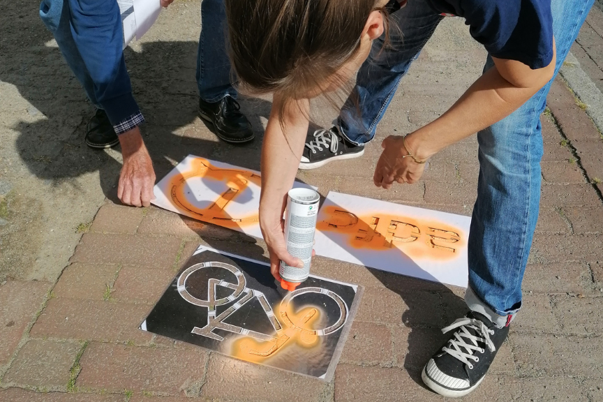 Wir rollen Radfahrerenden den roten Teppich aus, machen mit Schwimmnudeln auf den Sicherheitsabstand aufmerksam, packen falsch parkende Autos ein, verschenken kleine Dankestüten an Vorbeiradelnde, markieren Gefahrenstellen und und und.
