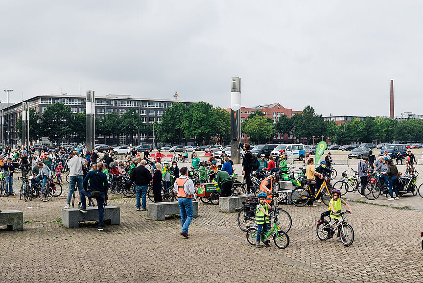 Die Demonstration endete mit einem Fahrradfest des Vereins "Autofreier StadTraum" auf dem Domshof. Vor Ort angekommen, konnten sich die Tourenteilnehmer*innen bei vielfältigen kulinarischen Leckerbissen vor der Markthalle Acht stärken und beim Infostand des ADFC mehr über nachhaltige Mobilität und Verkehrssicherheit erfahren.