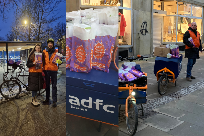 „Trotz der Kälte waren die Radfahrerinnen und Radfahrer gut drauf“, freute sich Lucie Haedecke, die stellvertretende Sprecherin des ADFC-Aktionsteams Bremen-Nord. Auch an der Bischofsnadel wurden die Tüten freudig entgegen genommen. Ein kurzer Plausch an der “Schiebestrecke” war häufig auch noch drin. Angesprochene Themen: gut geräumte Radstrecken in der Innenstadt, rutschiger Belag im Blockland und die ausgesprochene Verwunderung, ein Dankschön für so etwas Alltägliches wie Radfahren zu bekommen.